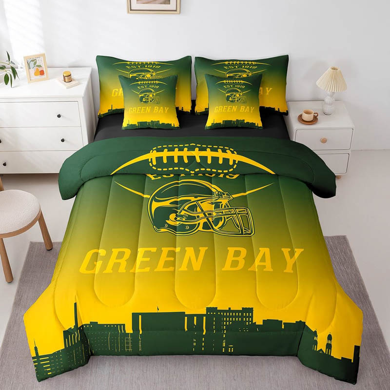 The green bay packers bed set quilt set quilts bedroom bedding set is a durable and soft bedding set made from breathable polyester microfiber. Designed for all seasons, the green bay packers bed set quilt set quilts bedroom bedding set offers lightweight warmth and comfort. The green bay packers bed set quilt set quilts bedroom bedding set includes a zipper closure for easy care and lasting convenience.