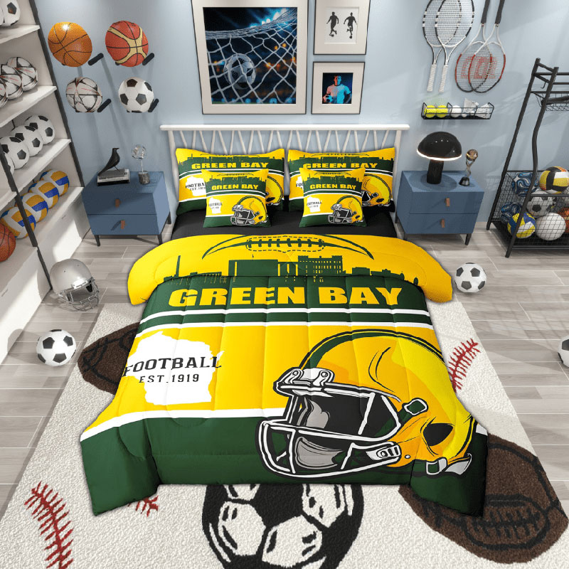 The green bay packers bed set quilt sets quilts bedroom bedding sets is a durable and soft bedding set made from breathable polyester microfiber. Designed for all seasons, the green bay packers bed set quilt sets quilts bedroom bedding sets offers lightweight warmth and comfort. The green bay packers bed set quilt sets quilts bedroom bedding sets includes a zipper closure for easy care and lasting convenience.